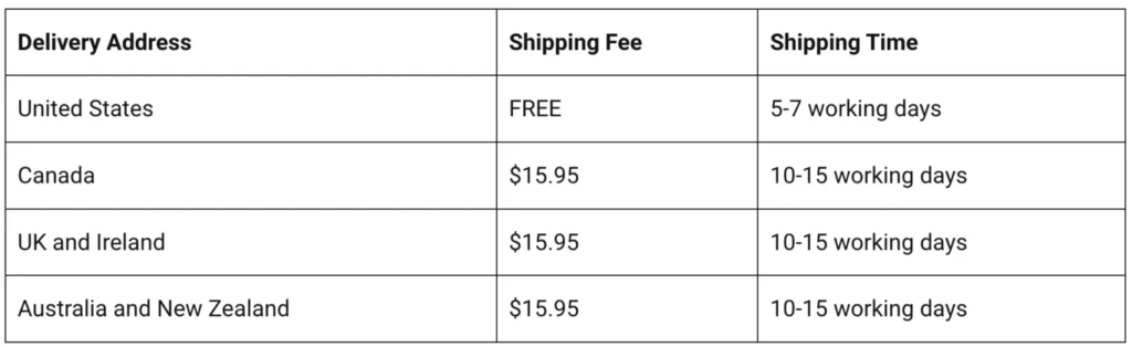 Orders are processed within 2 to 3 business days. Typical delivery is 5 to 7 days in the US and 10 to 12 days internationally (customs may affect timing). You’ll receive a tracking email within about 60 hours of purchase.